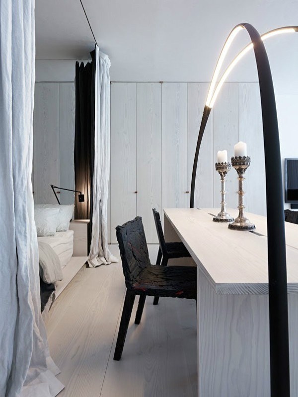 It is a luxury small apartment placed in literally one single room. Very elegant decor and white color gave opportunity to have everything you need in such a small place.